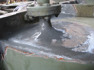 作業では慎重に腐食部を削り落としていきますが、錆のカタマリが取れて一気に油が噴出することもあります。